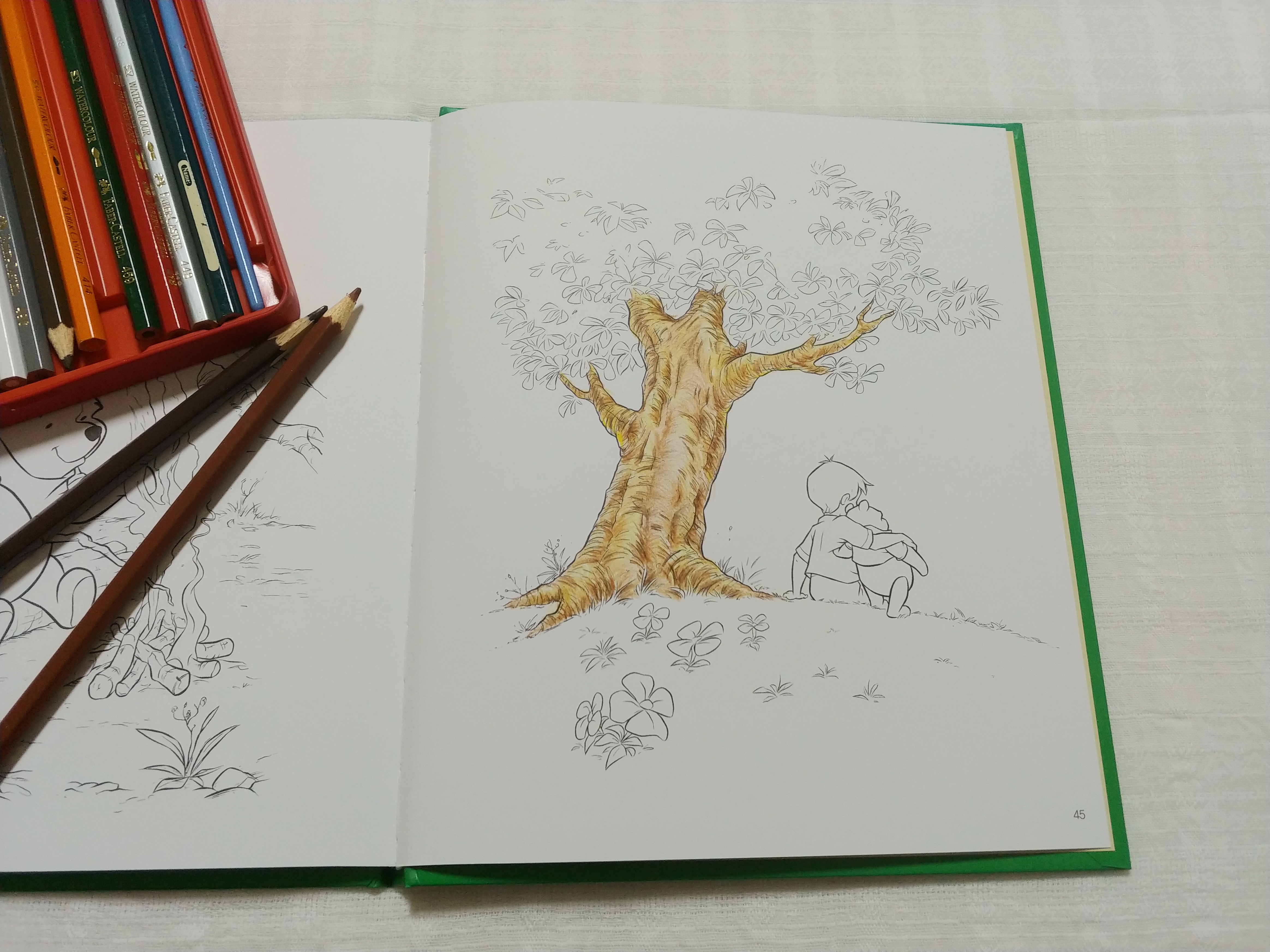 나무부터 색을 시작했어요. 하나하나 정성을 들였어요. 보이실지는 모르지만 여러 브라운 컬러를 가지고 굴곡진 나무의 결과 해가 비친다 생각하고 명암을 넣어봤어요. 책에서는 노을 지는 저녁인데 저는 봄 같은 느낌을 내보고 싶어서 나뭇잎도 푸르게 칠했답니다. 연두, 그린, 엘로 우등 다양한 색으로 했고요. 아래 꽃도 핑크, 바이올렛 계통은 다 사용했어요. 두 주인공 푸와 로빈이 안고 있는 모습은 하트 눈빛 발사하면서 칠했답니다ㅎㅎㅎ